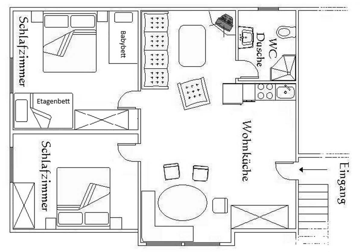 - 1 Wohnküche mit Sat-TV, CD-Radio, Sofa, vollausgestattete Küche inkl. Geschirrspüler, Ceran Kochfeld, Backofen, Kühlschrank mit Gefrierfach, Geschirrtücher, komplette Geschirr- und Besteckausstattung, Wasserkocher, Mikrowelle, Mixstab, Handrührgerät, Brotschneidemaschine, Toaster, Eierkocher, Kaffeemaschine